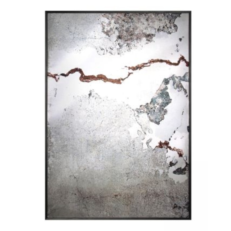 Black coloured metal framed mirror with quartz effect print.