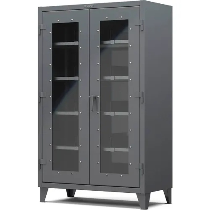 These all welded extra heavy duty storage cabinets feature clear view window fronts for viewing items while maintaining security. These industrial storage cabinets are made with 12 gauge all welded steel. Windows are break resistant transparent polycarbonate. Window panels are securely attached to doors using 5/16″ black oxide carriage bolts. Door open 180 and feature secure brass hinge pins. These security cabinets feature 3-point locking cast bronze handles with a padlockable hasp for added security. 14 gauge steel shelves adjust at 2″ increments and have a 1200 lb. shelf capacity. Electrostatic dark gray enamel finish. 7 gauge steel legs are 6″H to allow forklift access. Storage cabinets are shipped fully welded and ready to use.