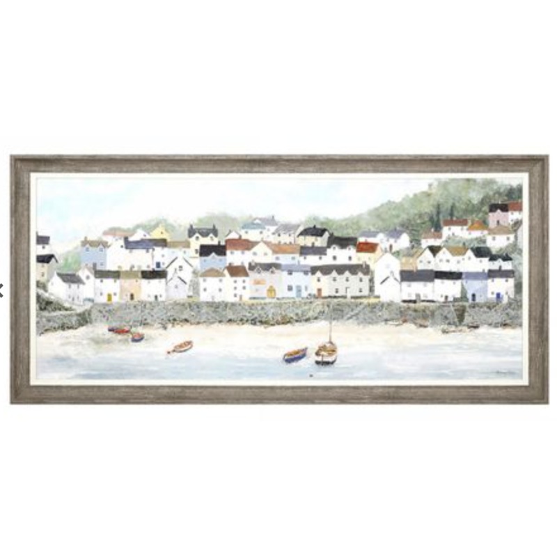 Lined up along the harbour wall, the white and pastel-washed cottages bask in the watery morning sun, patiently waiting for the boats and their crews to come home in Anthony Wallers idyllic quayside scene.Framed and unglazedSize:130x4x60cm / 51x1x24inch
