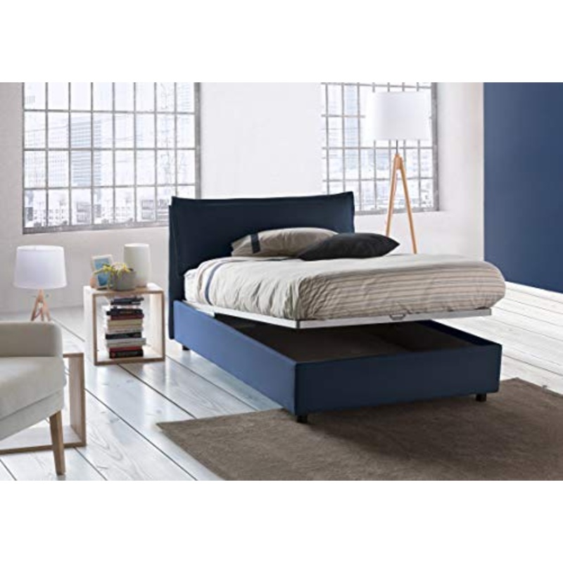 Dettagli: LETTO VERONICA A UNA PIAZZA E MEZZA - Letto a una piazza e mezza dal design moderno Veronica con testata e contenitore rivestiti in tessuto imbottito sfoderabile di colore Blu, adatto a materasso da 120x190 cm. STRUTTURA - La struttura del letto