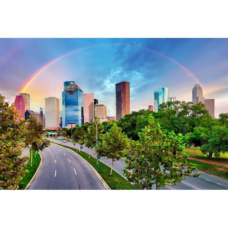 Floating Tempered Glass with FoilProduct FeaturesFramelessTempered Glass With Foil - Rainbow Over Houston - Dark Green40.0"W x 0.13"D x 60.0"H - 34.0 lb