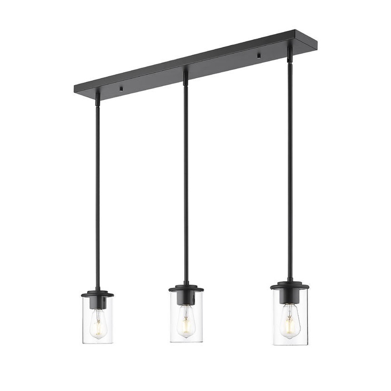 Set the tone in a warm, welcoming kitchen or dining room with the sleek, modern style of a three-light linear pendant. Ideal over an island or breakfast nook, it boasts a classic silhouette with a rectangular canopy and straight suspension, all in a bold matte black finish. Each of three lights is surrounded with a cylinder of clear glass, allowing for bright, true illumination.