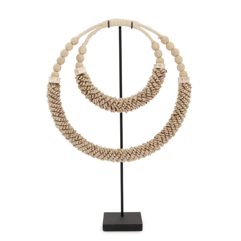 This eye-catching decoration on stand deserves a spot in your home! On a cabinet, in the bathroom or even in a covered terrace or garden – it will look stunning anywhere. The two circles are embellished by shells, bone, wooden beads and cotton rope. All made by true Balinese artisans.