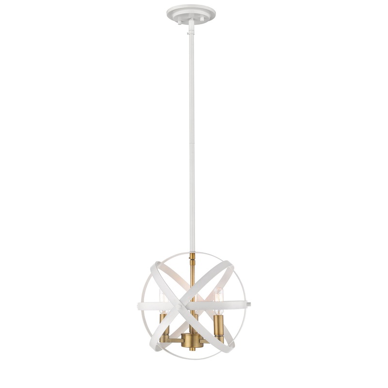 This hammered white and Oldee brass finish three-light pendant offers a light and airy ambiance and a perfect transitional motif with versatility. Stylish design weaves flat iron ribbons in an open orb shape that houses a collection of charming candelabra bulbs, creating a fun futuristic appeal.
