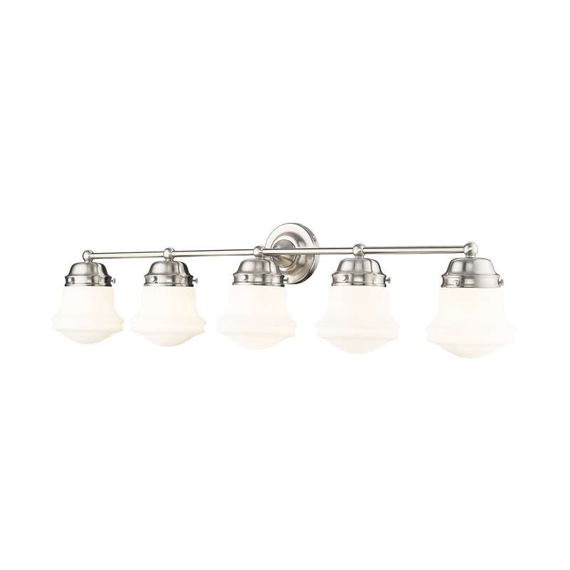 Span our vanity with a modern five-light bathroom fixture that pairs vintage schoolhouse glass with graceful curves to create a chic look and feel. Perfect for a variety of spaces, it showcases matte opal glass for exceptional, diffused illumination and pairs with a stylish brushed nickel finish to create a rich, refined ambiance in your bath.