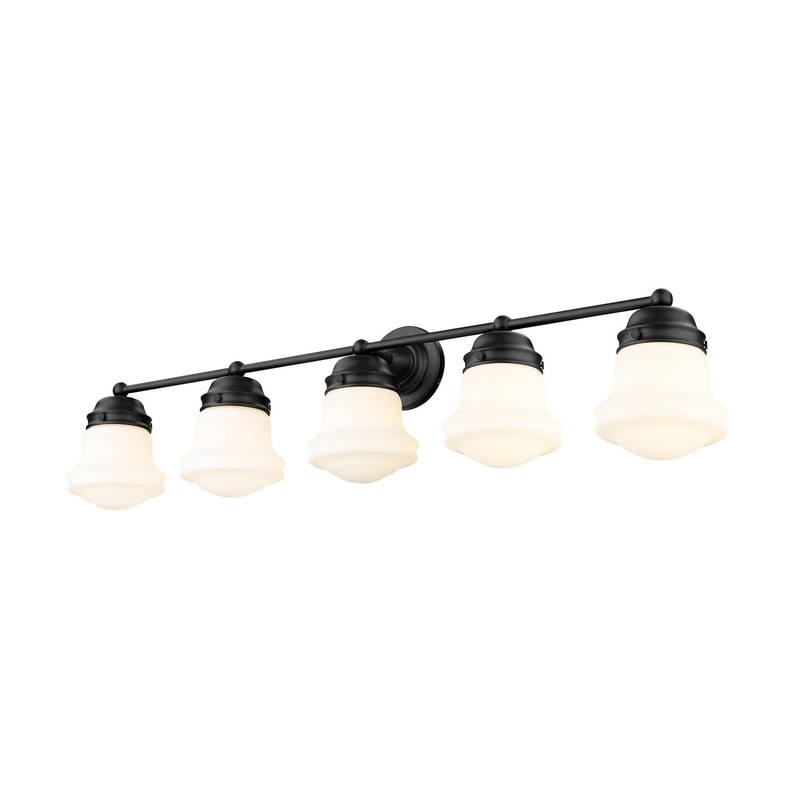 A large vanity calls for big style, and this transitional five-light bath vanity light delivers. With a charming village industrial motif, it incorporates a bit of nautical attitude and contrasts bold matte black steel with unique schoolhouse style shades