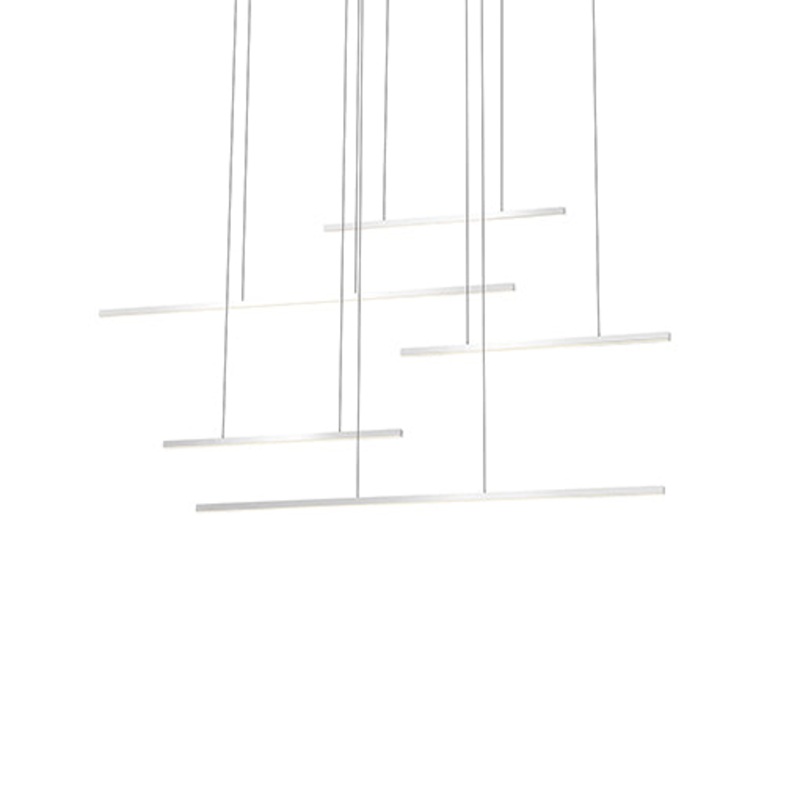 A cluster of disparate glowing lines have the appearance of levitation and movement, each element suspended by exceedingly fine cables. In a singular instance, the Vega Motion multi-pendant is a sculptural composition and, when used in tandem, an architect