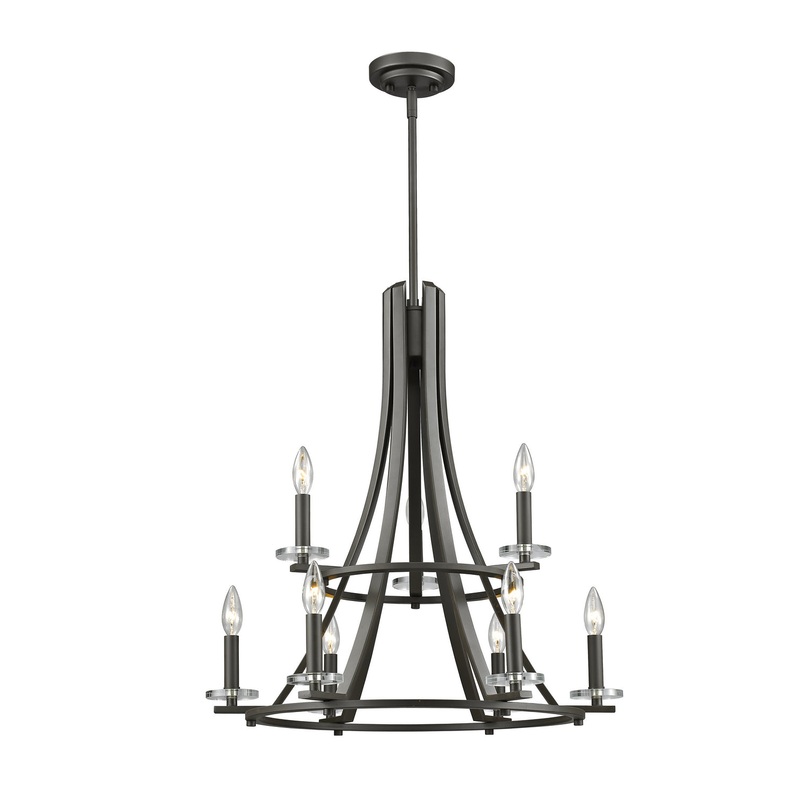 Graceful sweeping arms leading to classic candelabras sitting atop crystal bobeches. A classic design contemporized with clean lines and finished in dark bronze.Width: 25.00"Height: 27.00"Length: 25.00"Weight: 14.63 lbBulbs: 9 x 60.00W Candelabra Candelabr