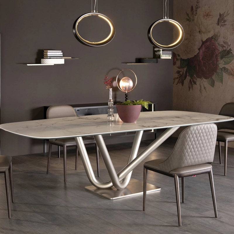 A lineris s a kortrs elegancia fejezdik ki a Victory asztalban, amely hatrozott szemlyisggel rendelkezik, amelyet a kt masszv, festett fmbl kszlt V alak talapzat harmonikus kombincija jellemez, amelyek knnyedn altmasztjk a nagymret asztallapot, amely a ren