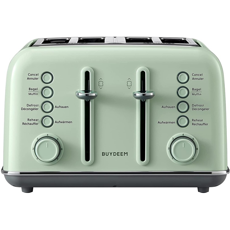 Your streamlined morning routine starts with BUYDEEM. Designed for efficiency and functionality, this 10-setting toaster is a must-have kitchen essential that reheats, defrosts, toasts bread, toasts the cut sides of bagels and more. With its pastel, vintage-style green exterior and dual control panels, this toaster will not only look great on your countertop but toast to perfection.