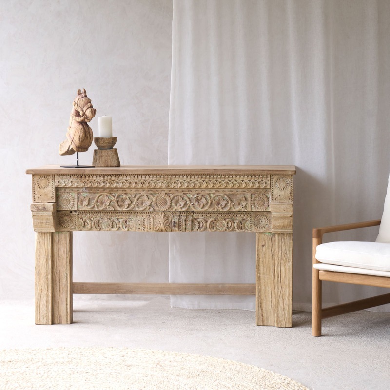 Brand:Nomad IndiaEnhance your living space with a stunning Vintage Teak Console sourced from Rajasthan, India. With its unique character and exquisite restoration, this hand-carved piece is sure to make a statement in any room.Repurposed from anantique doo
