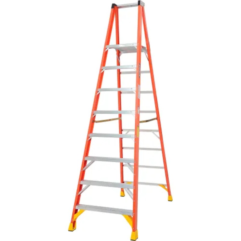 Light and durable, this TYPE 1A WERNER PLATFORM LADDER is 300 lb. rated. The new edge brace is designed to absorb impact and minimize damage to the side rails. Large platform provides secure and comfortable work area. Back-up plates reinforce all top connectors. Full set of rear horizontals spaced one per foot. Double riveted, slip-resistant Traction-Tred steps. Wider stance for stability. Seven layer fiberglass construction.