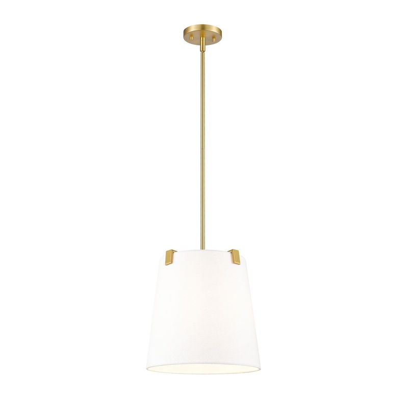 Make a statement in a modern or transitional space with a classic design in fixtures. This three-light pendant highlights islands or living spaces with a sophisticated look, blending chic modern gold finish steel framing and accent clips to a cream fabric shade, as candelabra lights filter through the diffused shade. This dimmable fixture offers variable lighting levels to suit different spaces.