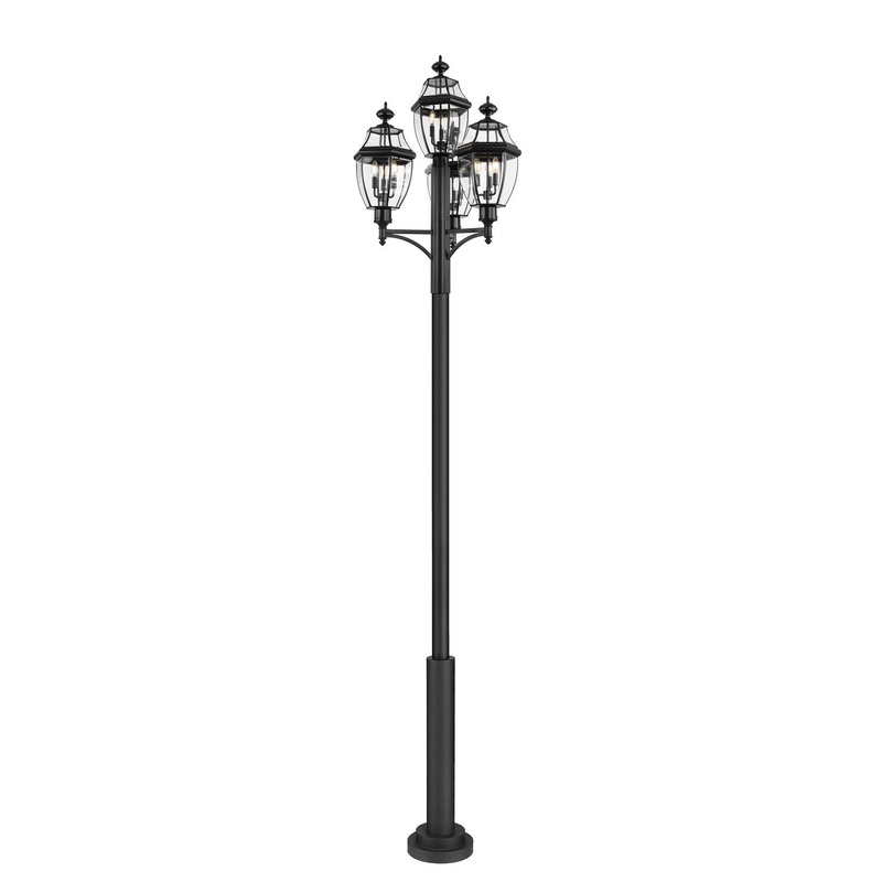 This three-light outdoor post mounted fixture adds a classic silhouette to the lighting in your patio, deck or other outdoor area. With its candelabra composition, the lamp provides soft, effective illumination. A multi-sided clear beveled glass shade has a black steel frame, creating an elegant impression.