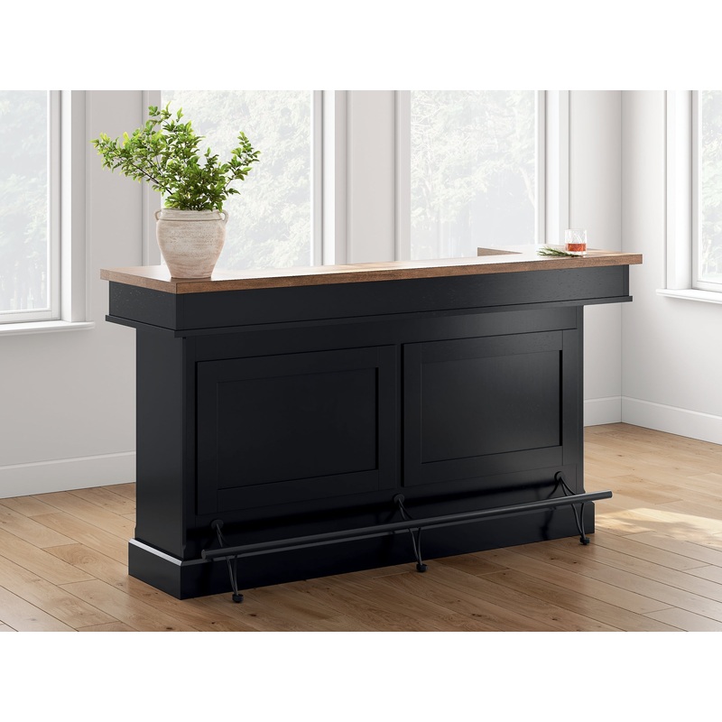 This bar dresses up your favorite farmhouse motifs with modern flair. Its handsome good looks are accentuated with a two-tone finish and a casual butcher block veneer top. The sturdy silhouette adds a hearty element, whether your style is vintage, country
