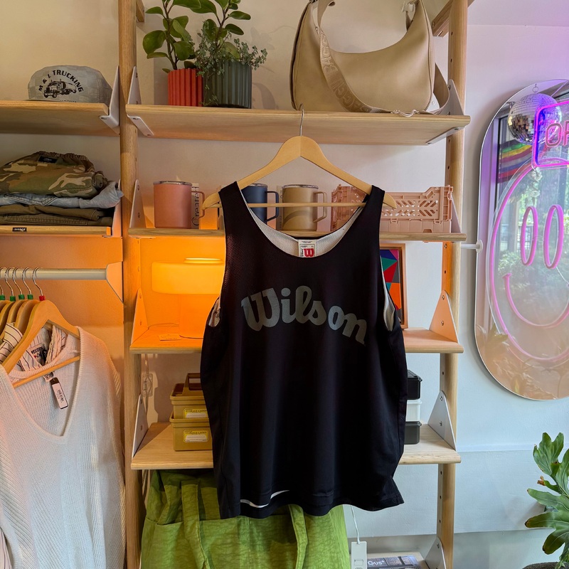 Brand: WilsonBlack jerseyMeasurements: 46" chest, 16" shoulder to shoulder, 26" shoulder to hem*Vintage and preloved items are as-is and final sale.