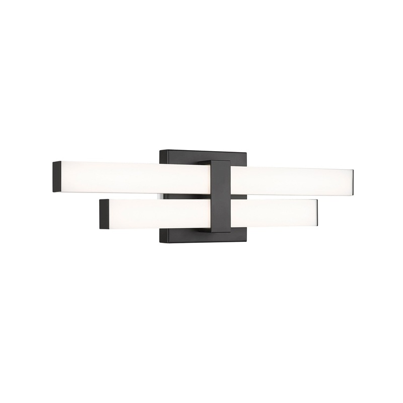 The optical benefit of clean lines and symmetry play a role in the striking look of this contemporary two-light bath light. Aluminum framing and accents offer contrast with a dramatic matte black finish, as graduated frosted bar diffusers align vertically