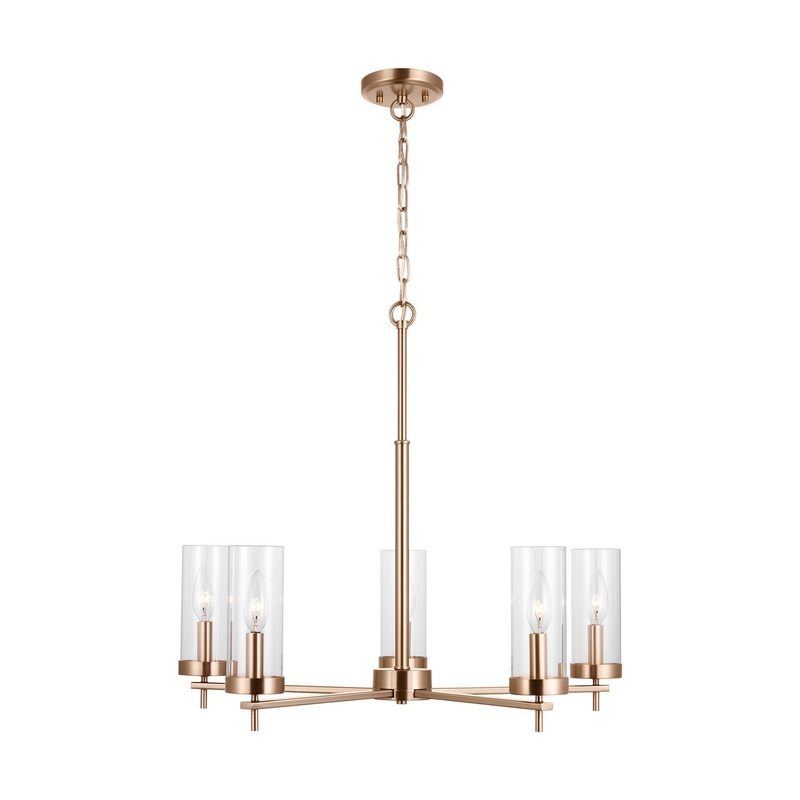 The Zire five light chandelier in Satin Brass finish embodies simple clean lines that strike a perfect balance of elegant yet minimalist design. Each of the lights sits on the round bottom rim, featuring an Edison-inspired design highlighted by a cylindrical glass shade. The assortment includes nine-light, five-light, and three-light chandeliers, a five light linear, one-light large and mini-pendants, and one-light, two-light, three-light and four-light wall/bath fixtures. A stylish and elegant addition to any room in the house. Zire is offered in a Brushed Oil Rubbed Bronze, Brushed Nickel, Chrome, Satin Brass or Midnight Black finishes.